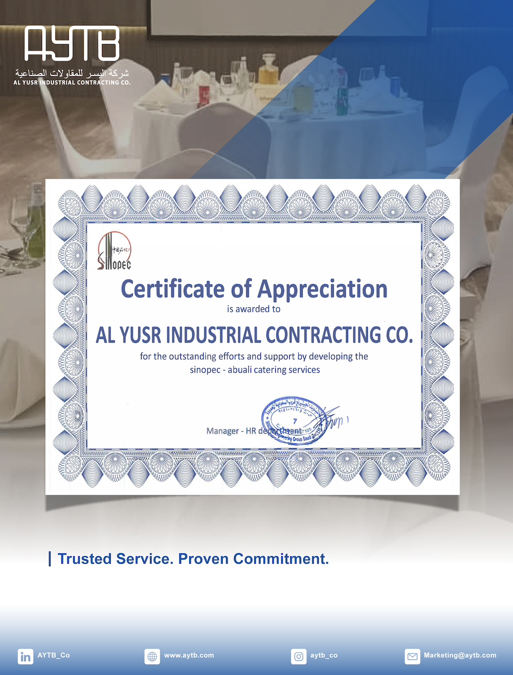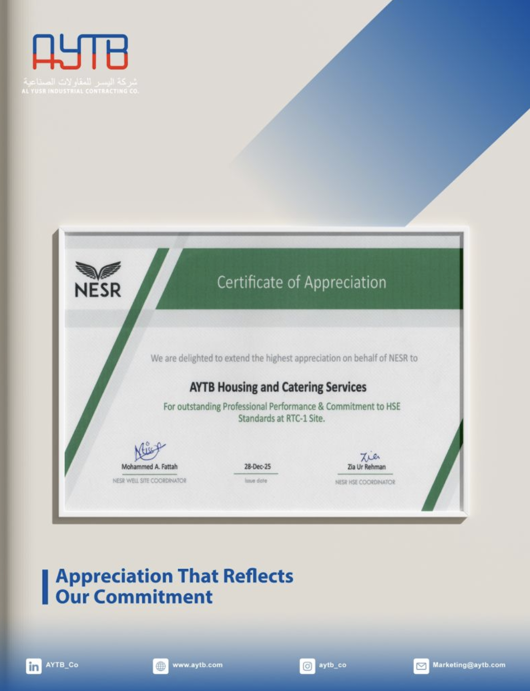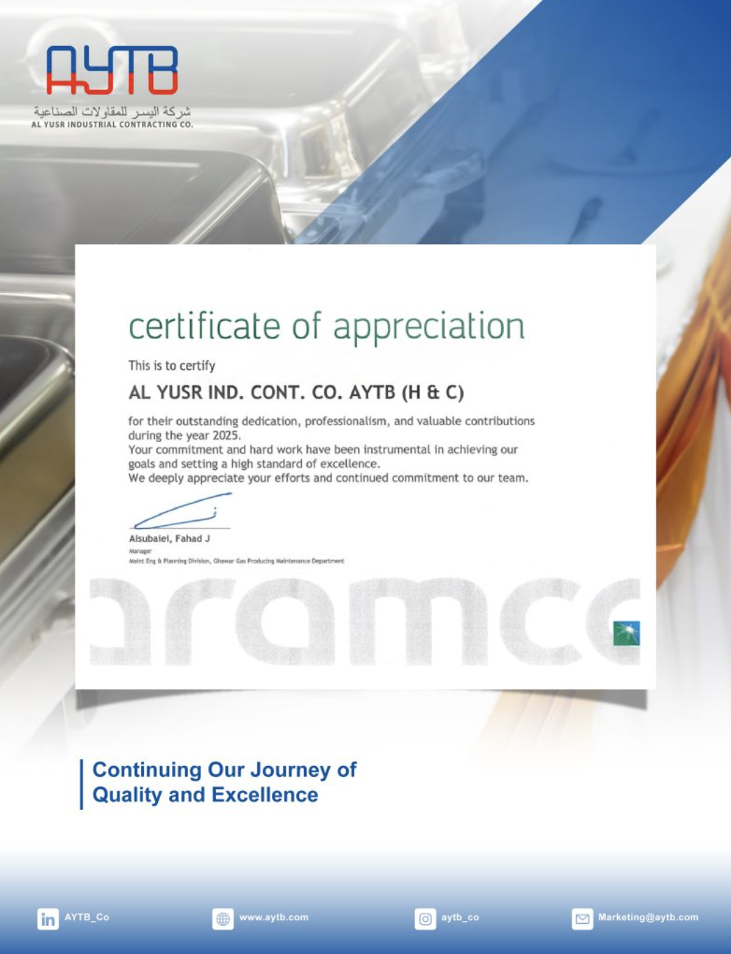 Al-Yusr Industrial Contracting Company (AYTB) is proud to receive a Certificate of Appreciation from Aramco in recognition of the outstanding....
