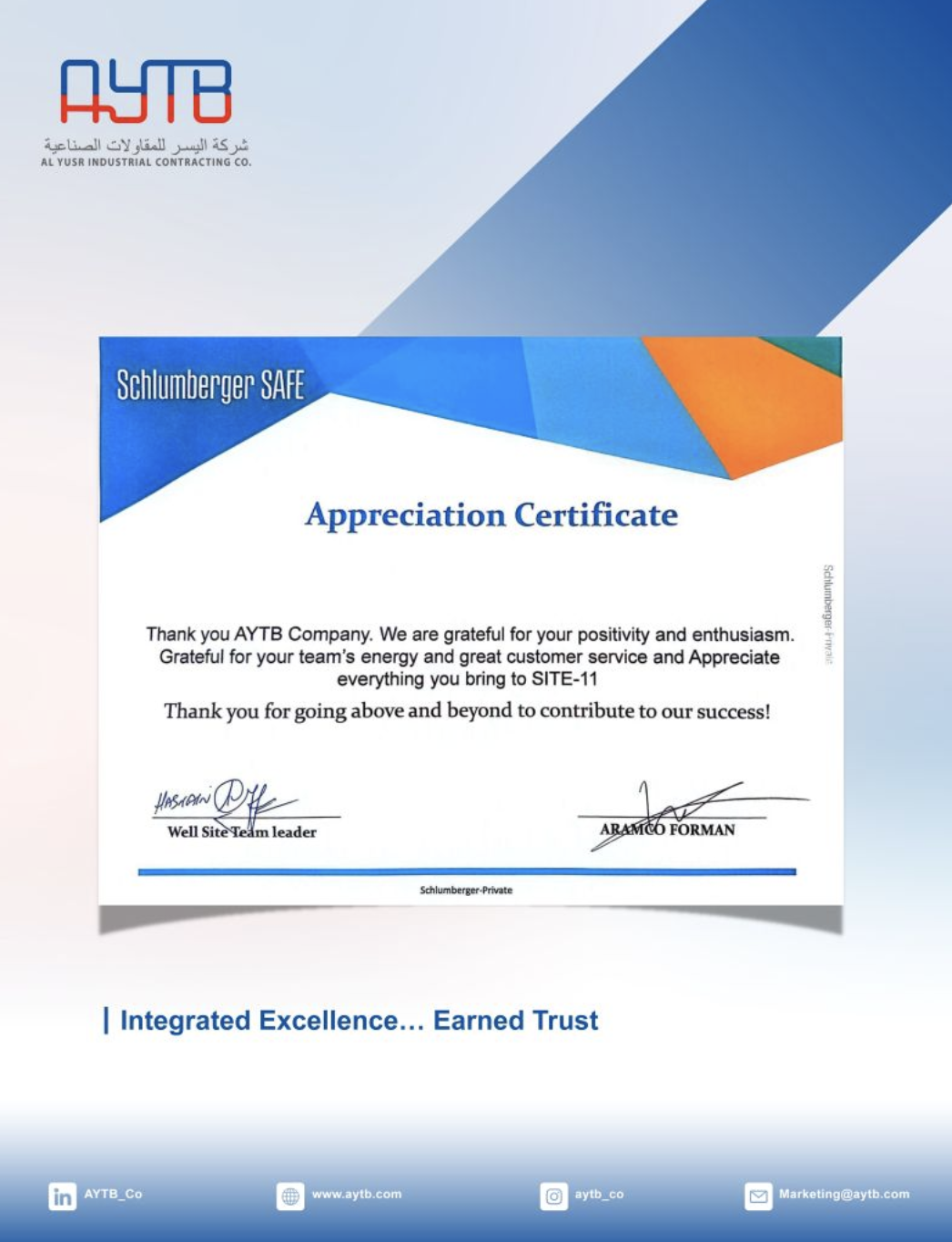 Schlumberger Recognizes AYTB’s Services