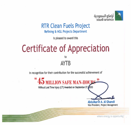 AYTB has always been unrivalled among other big contractors with its safety records and has been recognized by its clients with multiple awards for millions of safe man hours. This is because of one of the company's major assets its experienced and dedicated employees who ensure that any assigned job is done in a distinguished and safe manner.