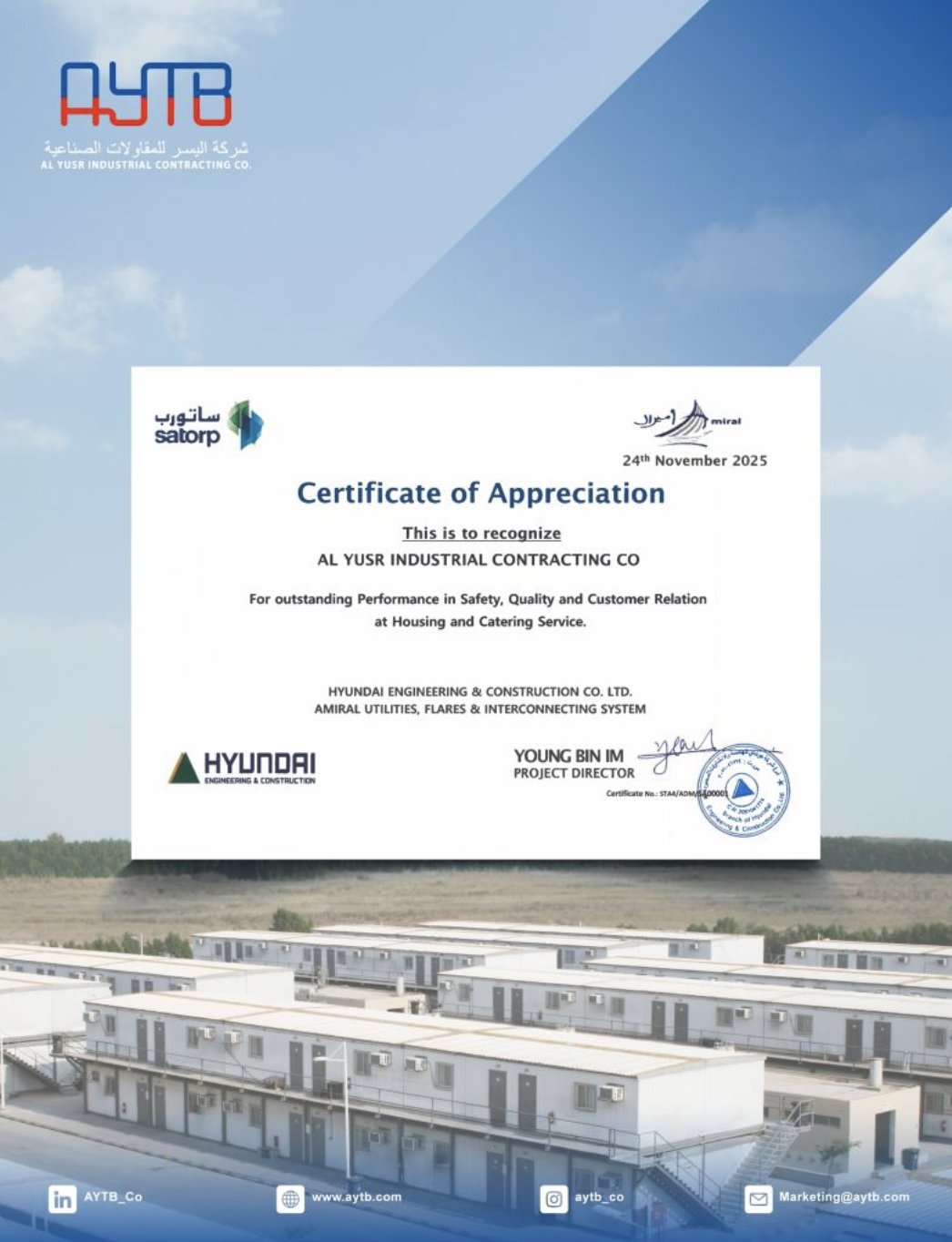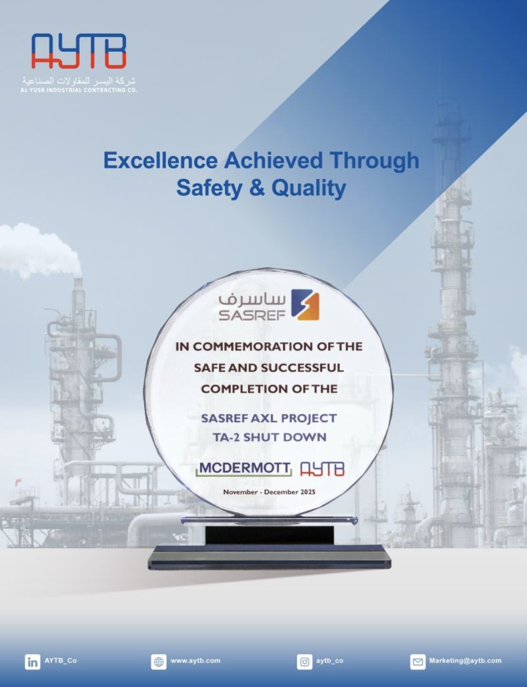 Al-Yusr Industrial Contracting Company (AYTB) is proud to receive a Certificate of Appreciation from Aramco in recognition of the outstanding....